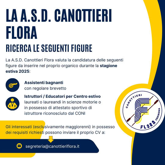 🛑 Attenzione 🛑 La Canottieri Flora ricerca personale: Assistenti Bagnanti e Istruttori – Educatori per centro estivo (laureati o laureandi in scienze motorie o in