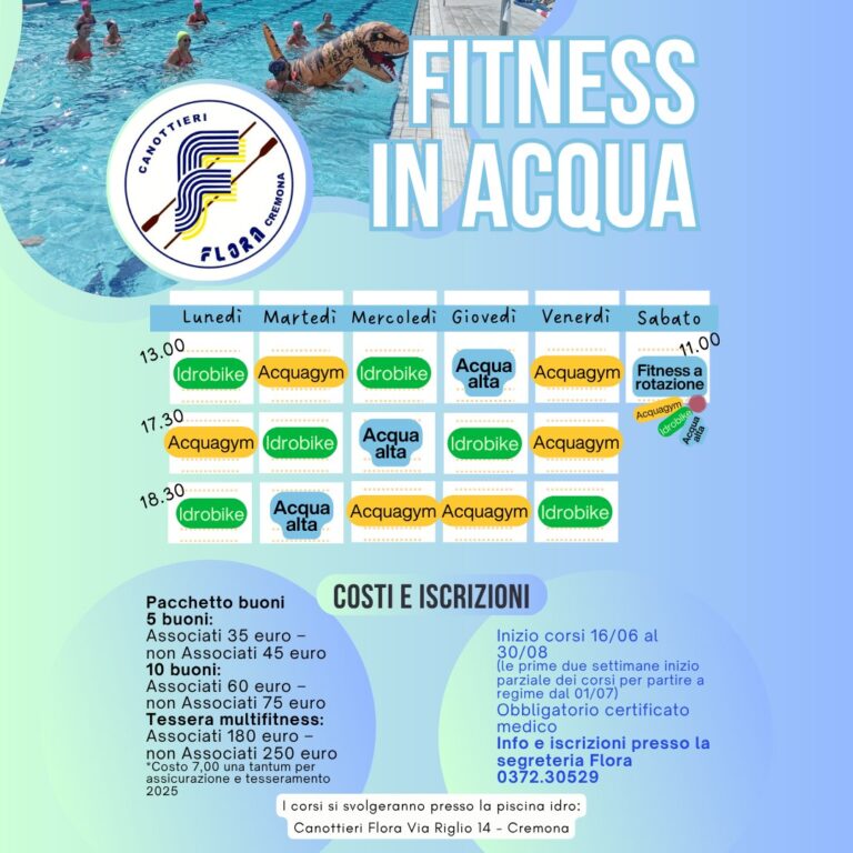 Grande successo per i nostri corsi di Fitness in acqua 2025! Dal 16/06 iniziano i corsi di FITNESS in acqua alla Canottieri Flora con le