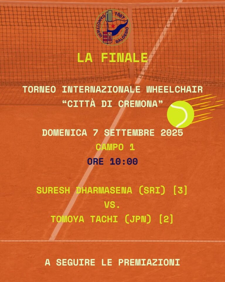 È tempo di finale al Torneo Internazionale Wheelchair “Città di Cremona” Domenica 7 settembre alle 10:00, sul Campo 1 della Baldesio, si sfidano: 🇱🇰 Suresh